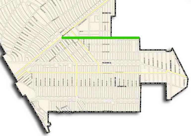 Burton Way is a continuation of South SM Blvd after it emerges from the Golden Triangle. East of Crescent, Burton changes character completely from small shops to wide boulevard with grassy median. This stretch and the median too are a legacy of the Pacific Electric ‘red car’ line that once stopped near the old Post Office on its way to Sawtelle. Rethinking Burton as a multi-modal transit corridor that would include bicycles is a great step back to a time when we could traverse the region without a car. Today Burton is a residential corridor that connects the business district to the commercial spine of Robertson Boulevard to the east, making the relatively higher density here a good opportunity for bike lanes (see the potential boulevard and suggested neighborhood bike streets illustrated on the map).