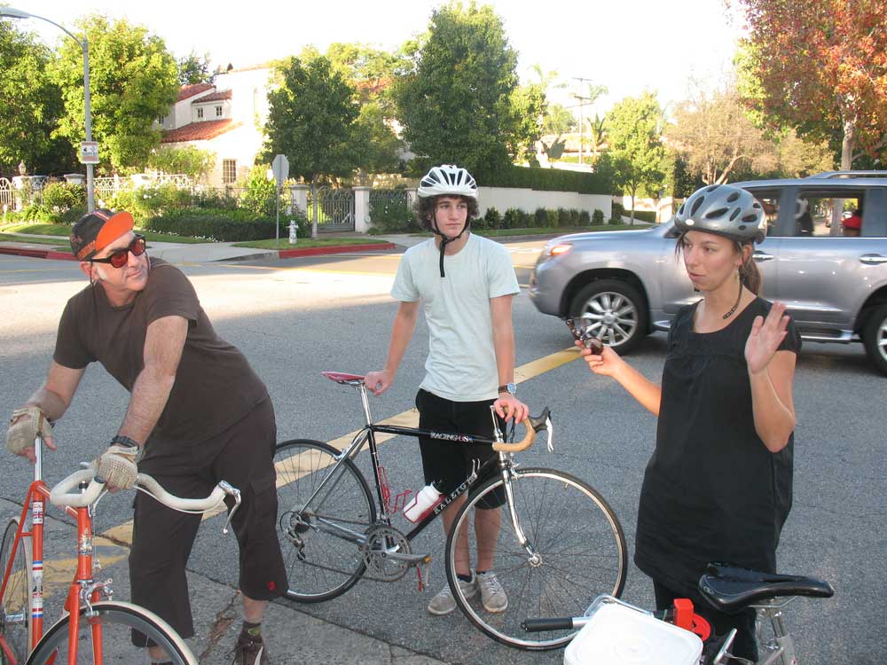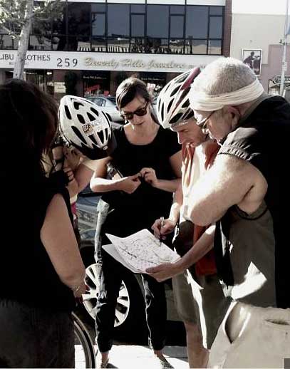 Our first Better Bike Beverly Hills ride went off without a hitch this past Sunday. It was our first opportunity to get out in the field. After several meetings talking about bike plans, we stopped at some key opportunity sites at the north end of the business district. On hand was Alexis Lantz, policy director for the Los Angeles County Bicycle Coalition (LACBC), who took to her saddle from Silver Lake to put her measuring wheel to Santa Monica boulevard. Alexis also put an official imprimatur on the ride. We’re a group new to the cycling advocacy scene, relatively speaking, and the LACBC has been very helpful in putting us in touch with local riders and even suggested Sunday’s ride. It won’t be the last. Here’s the recap!