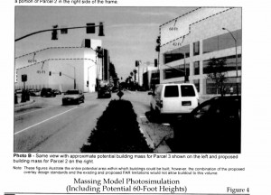 You see, the landowners are very eager to expand their margins, but as Council knows, and as neighboring residents fear, those fatter margins must mean higher structures (modeled at right in an older Gateway zone study) and yet more traffic for an area that is already a congestion disaster.