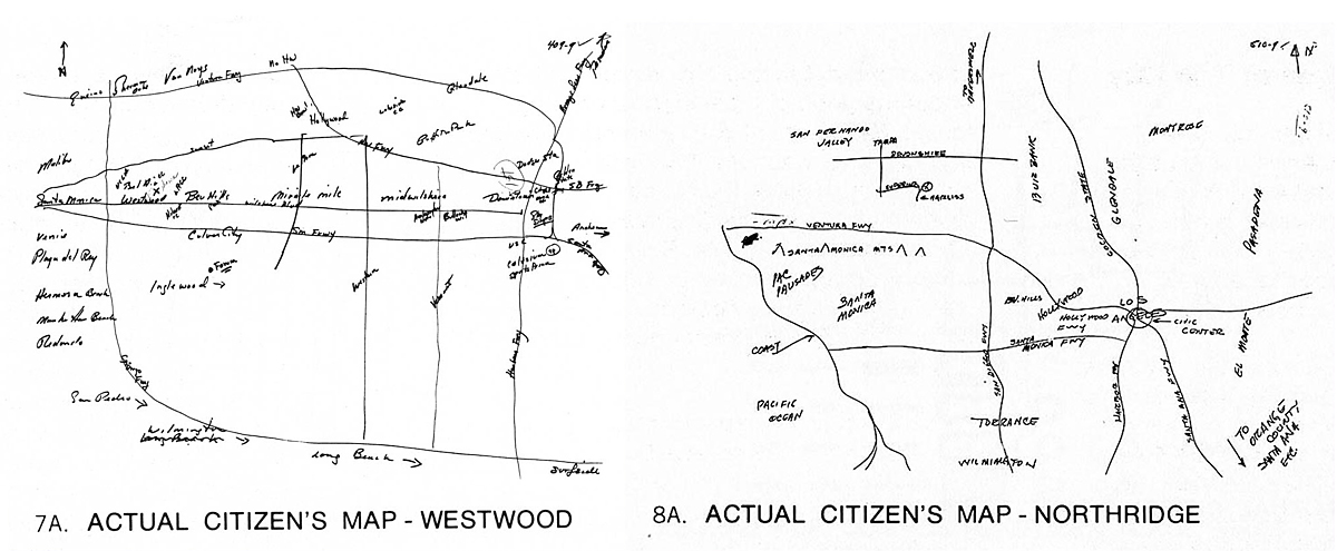 Consider these mental maps pulled from a Los Angeles planning document from 1971. Each of us holds in our mind a different concept of city space, yet often they are structured by the street network.